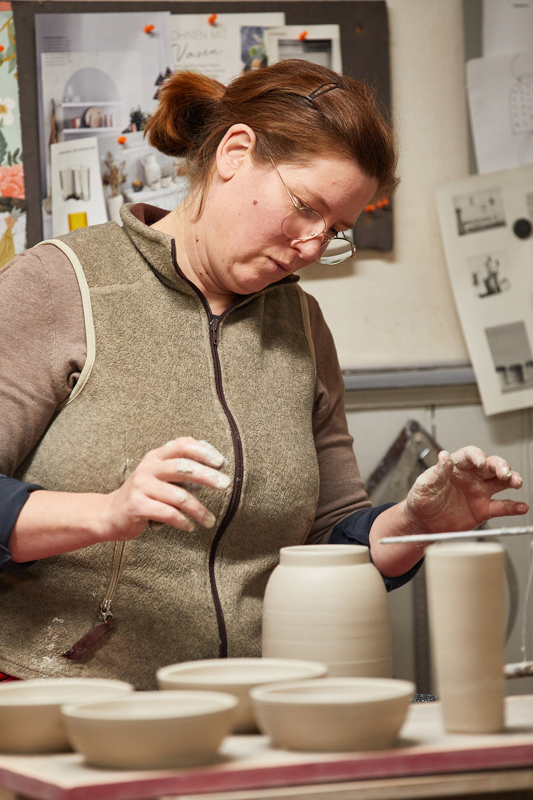 Die Stücke frei auf der Töpferscheibe zu drehen ermöglicht mir Ideen spontan umzusetzen und die Wirkung der Form unmittelbar zu überprüfen. Das Ergebnis ist im Idealfall eine Tasse, aus der der Kaffee besonders gut schmeckt, oder eine Vase, an der ich mich jeden Tag freuen kann.